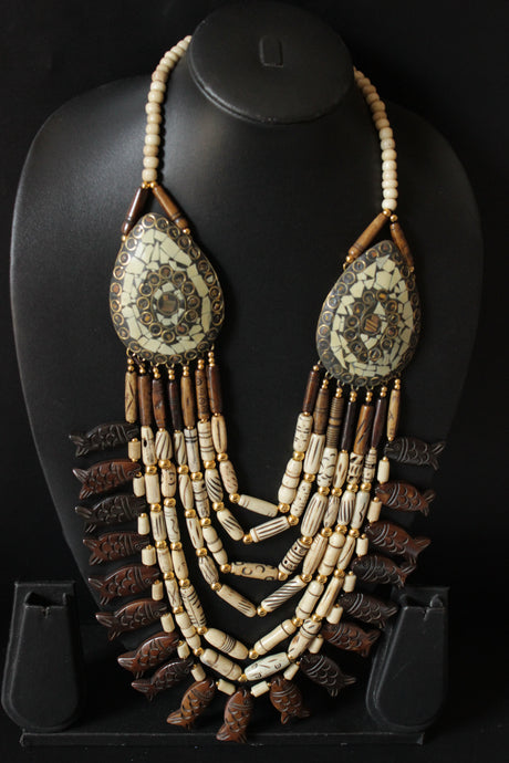 Engraved Ivory and Brown Bone Beads Handcrafted Multi-Layer African Tribal Necklace