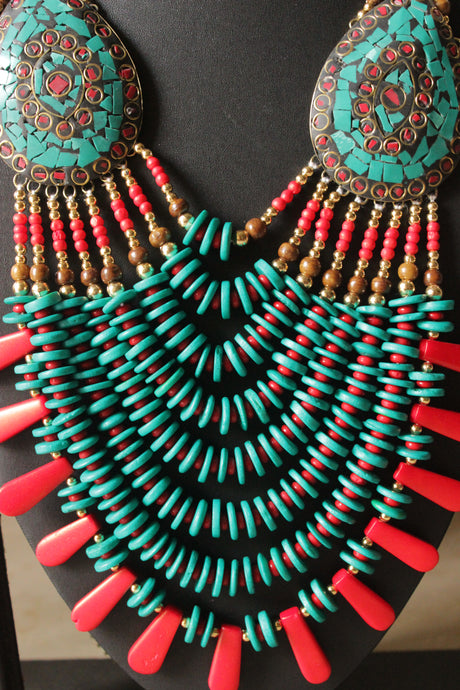 Turquoise & Red Bone Beads Handcrafted Multi-Layer African Tribal Necklace