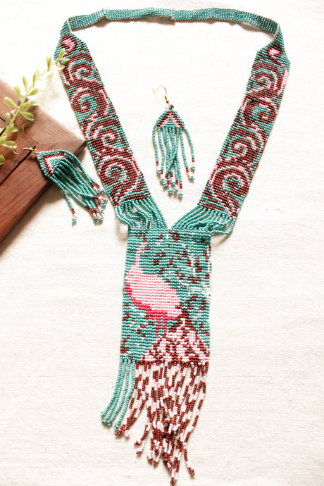 575 INR899Unit price /UnavailableBrown and Blue Peacock Motif Handmade Beaded Long Necklace Set