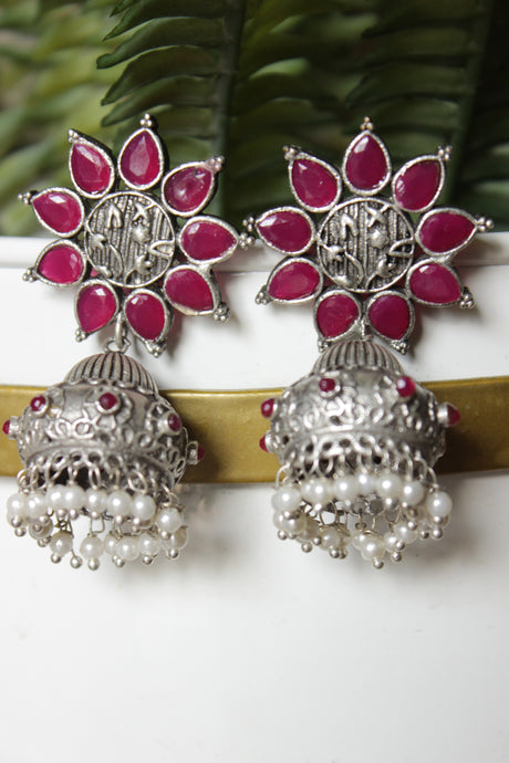 425 INR600Unit price /UnavailableBridal Plum Glass Stones Embedded Silver Finish Flower Motif Dangler Jhumka Earrings in Brass