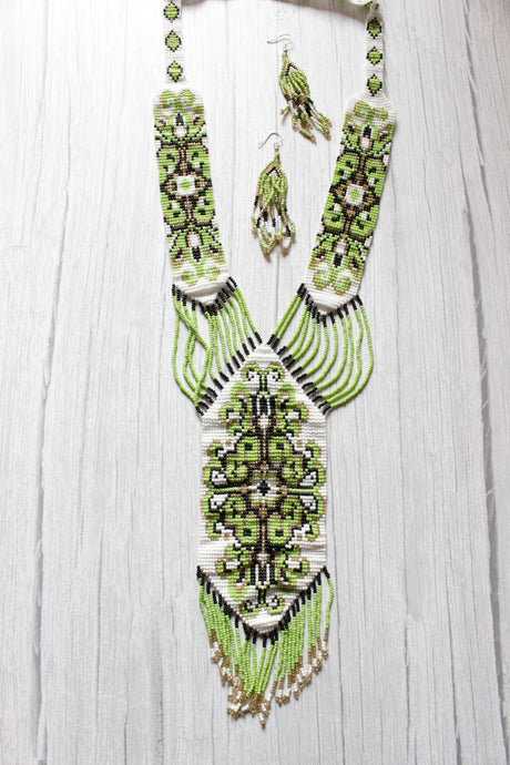 450 INR600Unit price /UnavailableGreen and White Elaborate Handcrafted Beaded Necklace Set with Dangler Earrings