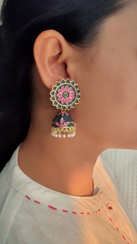 450 INR599Unit price /UnavailableGreen and Pink Handpainted Meenakari Jhumkas