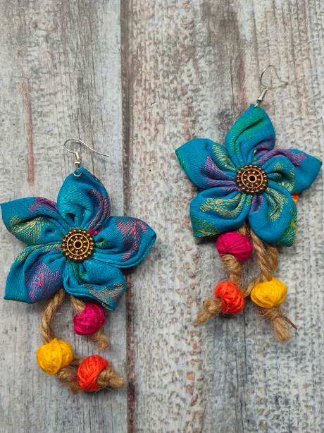 375 INR500Unit price /UnavailableHandcrafted Sky Blue Flower Fabric Earrings with Jute Danglers