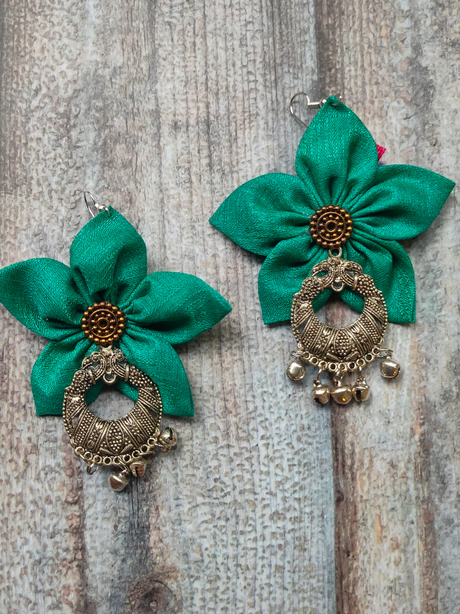 325 INR450Unit price /UnavailableHandcrafted Sea Green Flower Fabric Earrings with Peacock Motif Metal Danglers