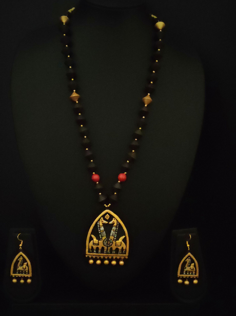 325 INR450Unit price /UnavailableHandcrafted Red, Golden and Black Religious Motif Terracotta Clay Necklace Set