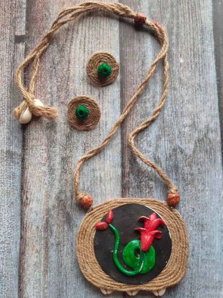 330 INR600Unit price /UnavailableHandcrafted Terracotta Flower Motif Jute Necklace Set with Shell Work