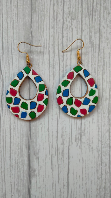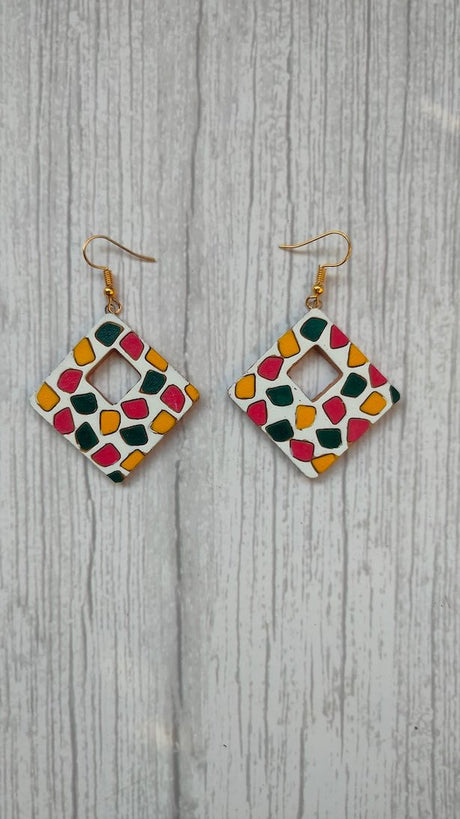 425 INR500Unit price /UnavailableVery low stock (1 unit)Handpainted Teardrop White & Multi-Color Terracotta Clay Dangler Earrings