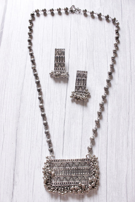 599 INR700Unit price /UnavailableVery low stock (1 unit)Matka Motifs Ghungroo Beads Embellished Oxidised Finish Dangler Earrings