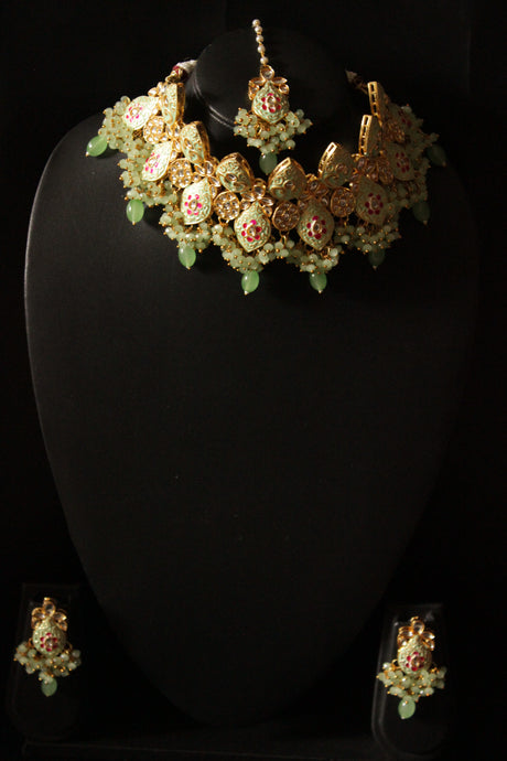 575 INR1,000Unit price /UnavailableVery low stock (1 unit)Meenakari Work Sea Green Stones and Beads Embedded Elaborate Choker Necklace Set