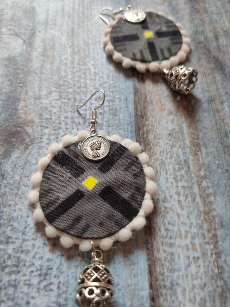 575 INR999Unit price /UnavailableVery low stock (1 unit)Monochrome Fabric Earrings with Jhumka Ends