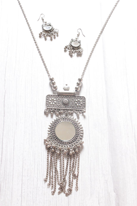 350 INR450Unit price /UnavailableMirror Work Pendant and Earrings Flower Motif Long Chain Silver Finish Metal Necklace Set
