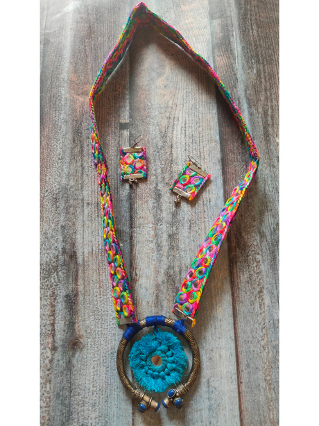 750 INR1,099Unit price /UnavailableMulti-Color Fabric Beads Paan Shape Pendant Braided Threads Necklace Set