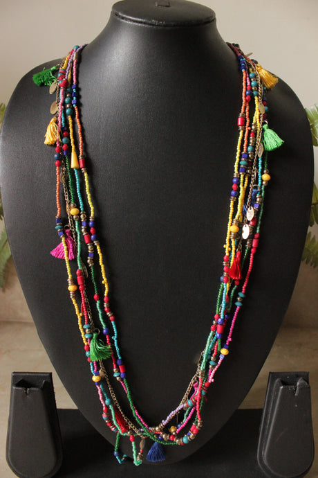 599 INR699Unit price /UnavailableMulti-Layered Layered Fabric, Beads and Metal Charms Long Necklace