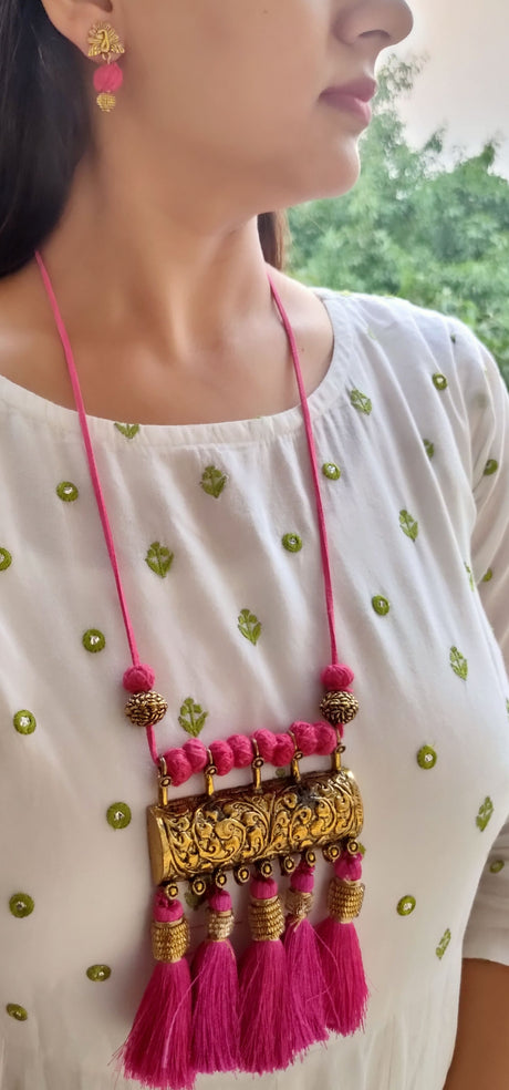 575 INR899Unit price /UnavailablePink Thread Closure Necklace Set with Fabric Beads and Jhumka Earrings