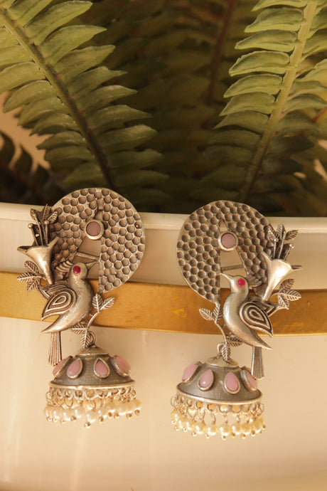 400 INR500Unit price /UnavailablePink Stones Embedded Oxidised Silver Finish Shell Work Jhumka Earrings