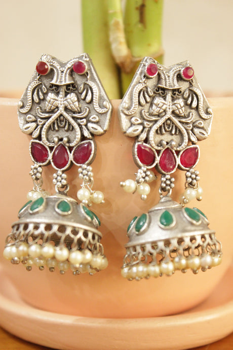 450 INR550Unit price /UnavailableRuby Red and Green Glass Stones Embedded Oxidised Finish Jhumka Earrings