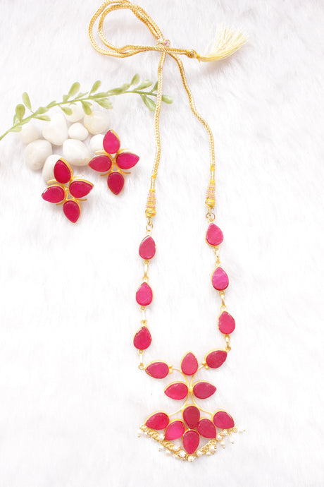 325 INR525Unit price /UnavailableRose Pink Raw Natural Glass Stones Embedded Gold Toned Adjustable Length Necklace Set