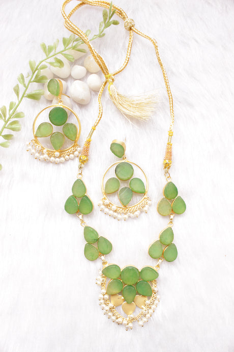 575 INR650Unit price /UnavailableSea Green Raw Natural Gemstones Embedded Gold Finish Chain Necklace Set