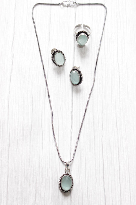 325 INR450Unit price /UnavailableSet of 2 - Sea Blue Transparent Natural Stone Embedded Necklace Set in Silver Finish with Ring