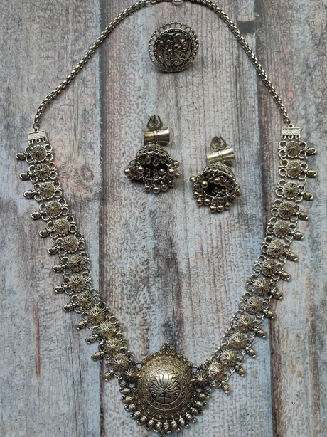 475 INR999Unit price /UnavailableSet of 3 - Lotus Motif Long Chain Necklace with Ring and Trishul Earrings