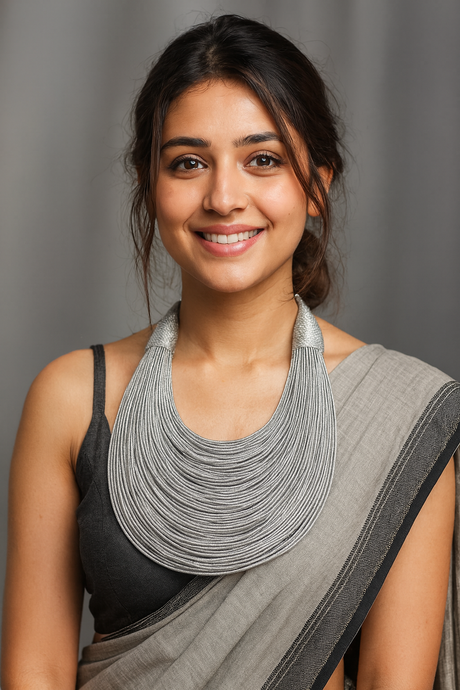 375 INR499Unit price /UnavailableSilver Grey Handmade Silk Threads Multi-Layer Statement African Choker Necklace