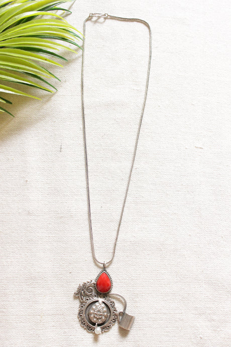 1,000Unit price /Unavailable Tea Kettle and Cup Shape Petite Silver Chain Oxidised Finish Necklace Embellished with Red Stone