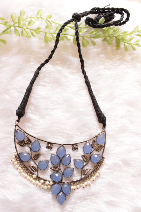 650Unit price /Unavailable Teal Blue Raw Natural Gemstones Embedded Flower and Leaf Motifs Adjustable Thread Closure Necklace