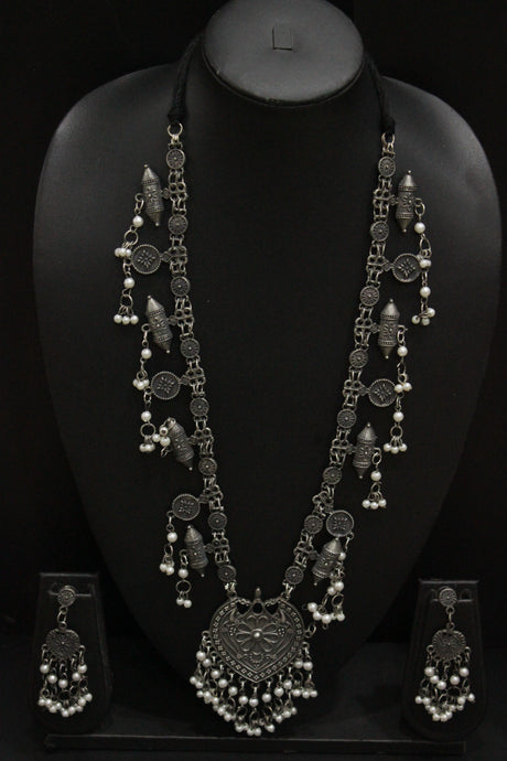 599 INR699Unit price /UnavailableTribal Warrior Motif Charms Long Chain Oxidised Finish Necklace Set Accentuated with White Beads