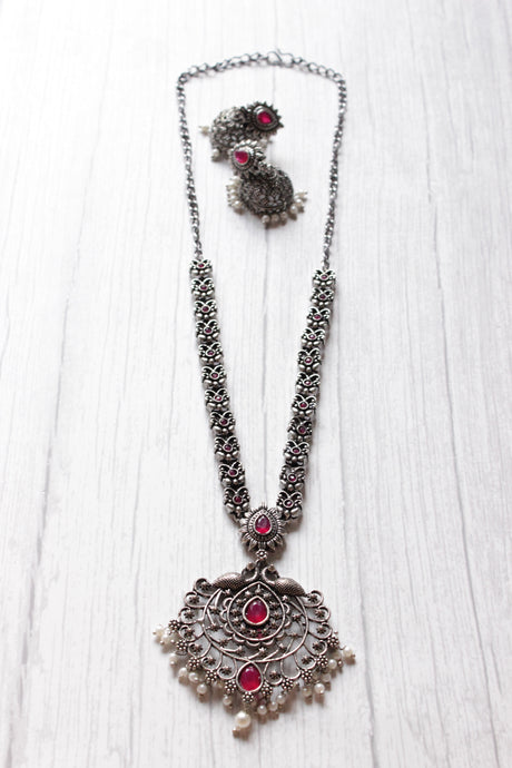 Two Swans Motifs Oxidised Finish Jaali Pattern Long Chain Necklace Set with Jhumka Earrings