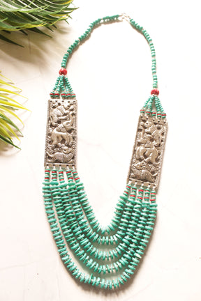 Turquoise Coral Seed Beads Multi-Layer Elephant Motif Necklace with Oxidised Finish Metal Detailing
