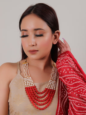 Red and White Glass Beads Braided with Gold Metal Beads 5 Layer Gold Finish Necklace
