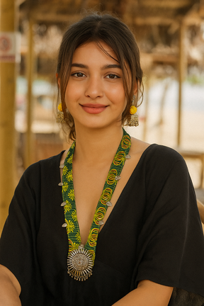 Green Block Printed Fabric Collar Necklace Set with Metal Pendant and Charms is backordered and will ship as soon as it is back in stock.