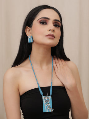 Ikat Printed Fabric Necklace Set with Metal Leaves Detailing