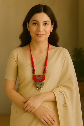 A striking blend of bold color and vintage charm, this necklace set pairs deep red fabric with antique gold-finish metal accents to create an accessory that’s both rooted and radiant. The layered design adds dimension, while the central pendant brings a sense of balance and focus. It’s perfect for days when you want your jewelry to do the talking.
