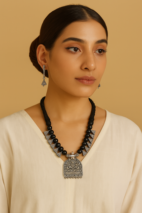 Stringed Glass Beads and Charms Statement Flower Motif Metal Pendant Necklace Set