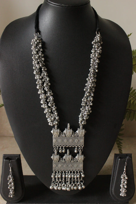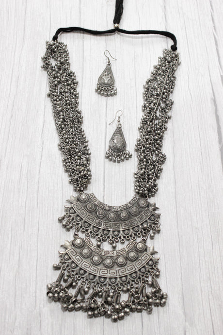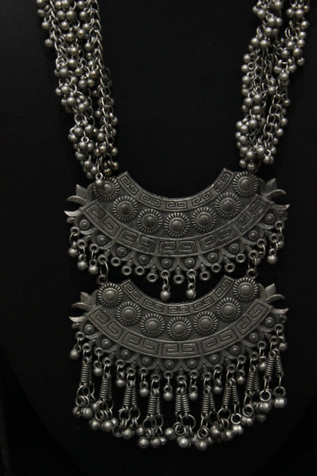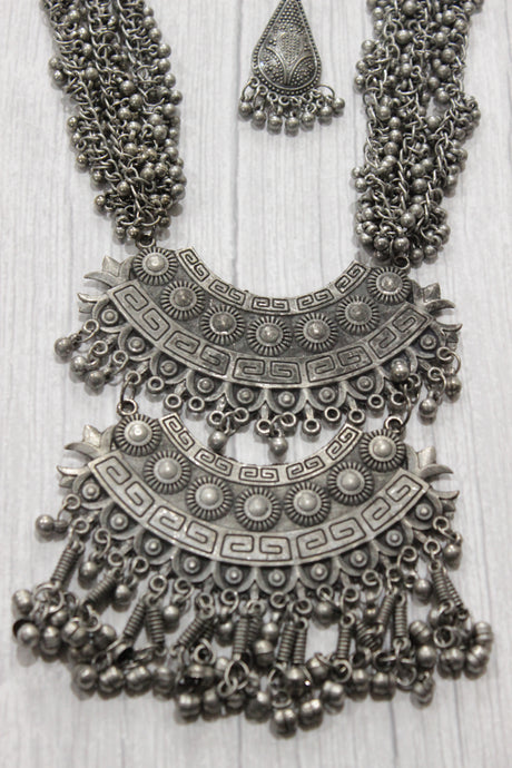 2 Layer Pendant Ghungroo Beads Embellished Oxidised Finish Elaborate Metal Necklace Set