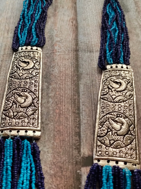 Blue Beaded Multi Layered Necklace Set with Metal Detailing