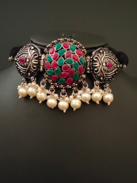 Intricately Detailed Glass Stones Embedded Oxidised Finish Chain Necklace