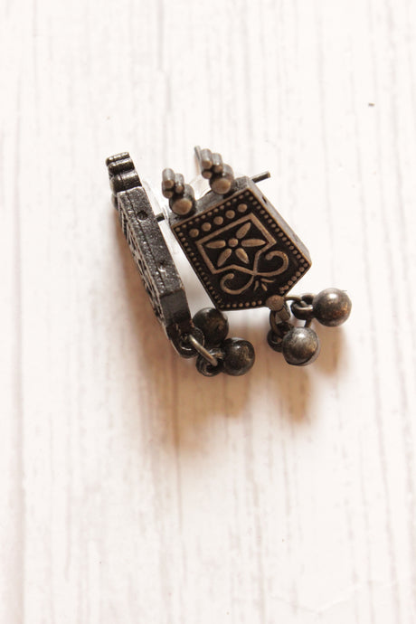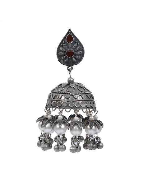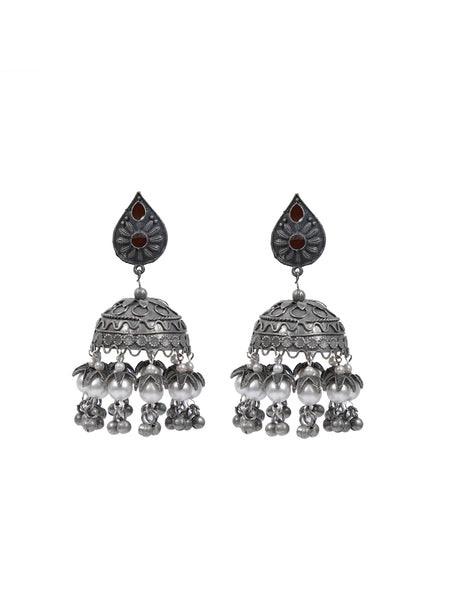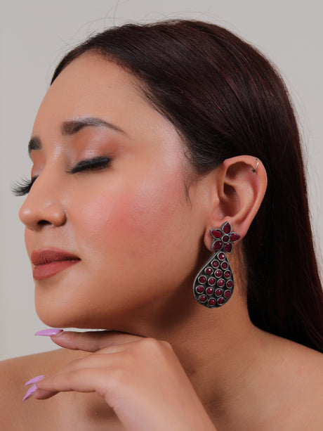 Oxidised Finish Flower Motif Teardrop Earrings Embedded with Ruby Red Stones