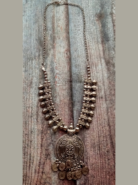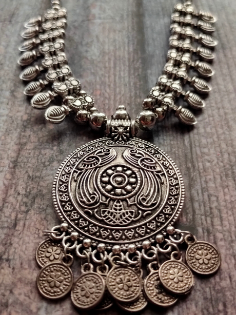 Intricately Crafted Metal Necklace with Coins and Peacock Detailing