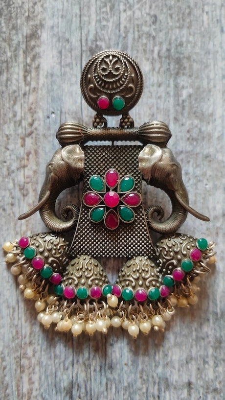 Red & Green Rhinestones Elephant Motif Elaborate Metal Earrings