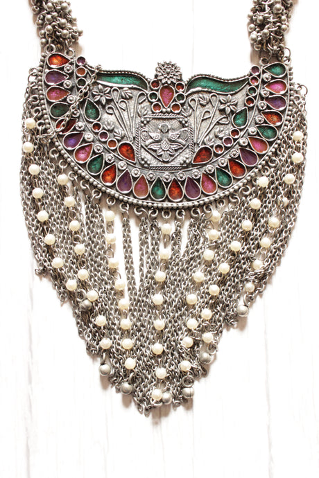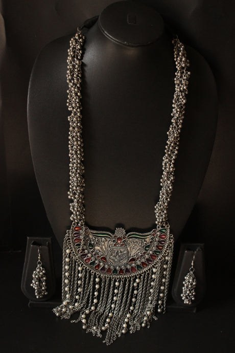 Elaborate Enamel Painted Oxidised Finish Afghani Necklace Set Accentuated with Ghungroo Beads