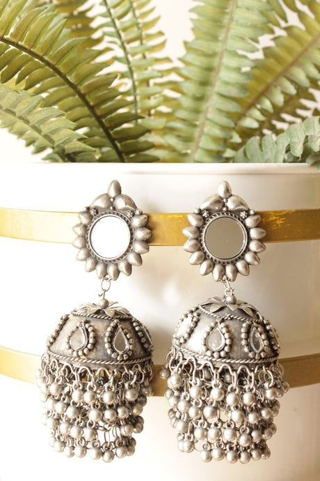 Mirror and Glass Stones Embedded Premium Oxidised Finish Brass Jhumka Earrings