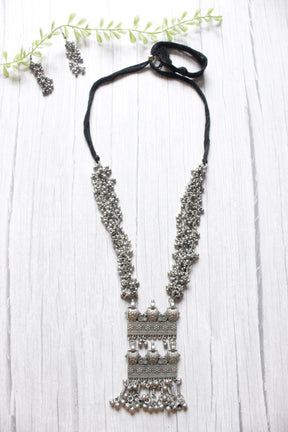 Metal Beads Embellished Dori Closure Oxidised Finish Chain Necklace