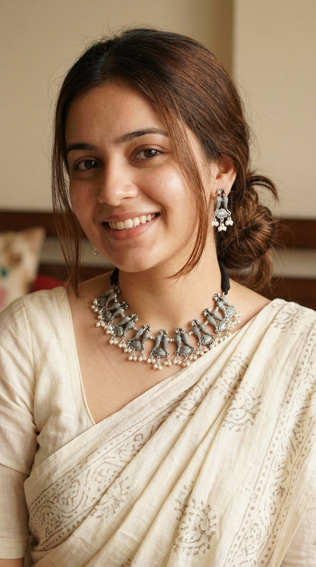 Peacock Motif thread Closure Choker Necklace Set with Long Dangler Earrings