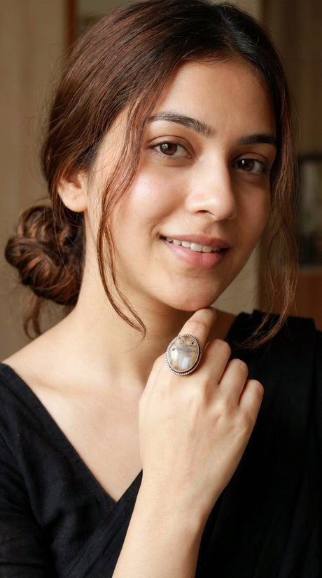 Shaded White & Brown Glass Stone Embedded Oxidised Finish Adjustable Ring