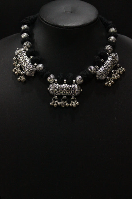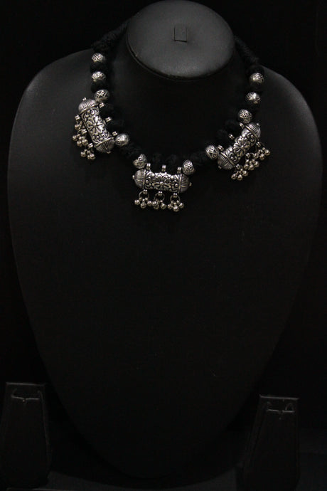 Oxidised Finish Metal Charms Braided with Fabric Beads Adjustable Length Choker Necklace
