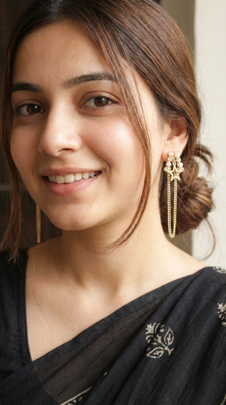 Pearl and Glass Stones Star Motifs Gold Toned Chain Earrings