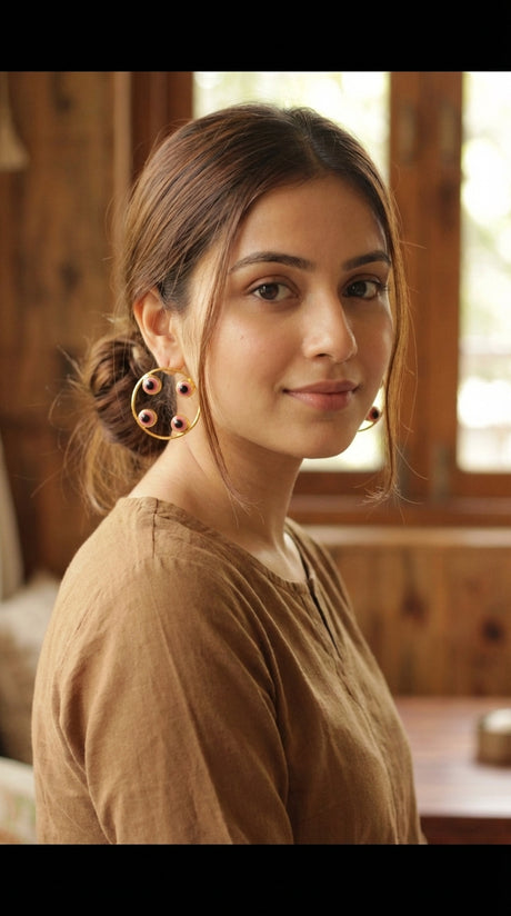 Red Evil Eye Embedded Gold Finish Hoop Earrings