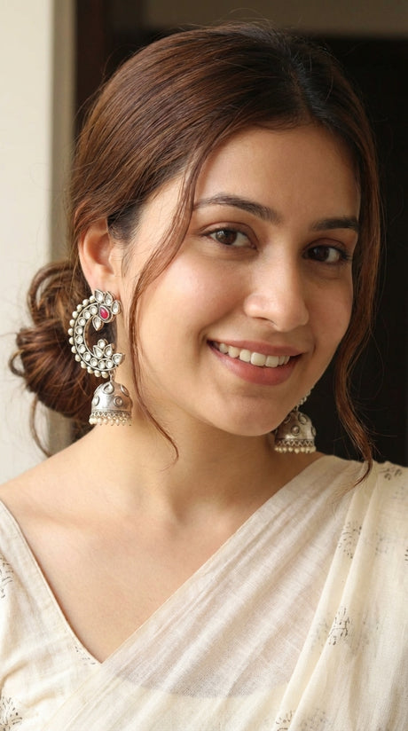 Kundan Stones Embedded Peacock Shape Premium Oxidised Finish Jhumka Earrings